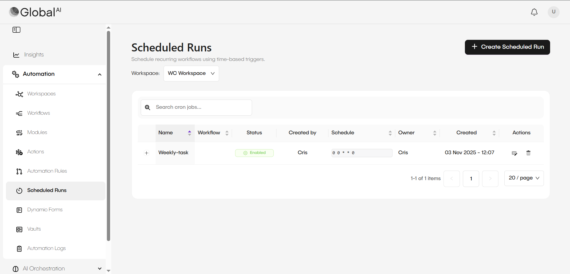A guide on defining and managing scheduled runs, or cron jobs, inside the GlobalAI platform.